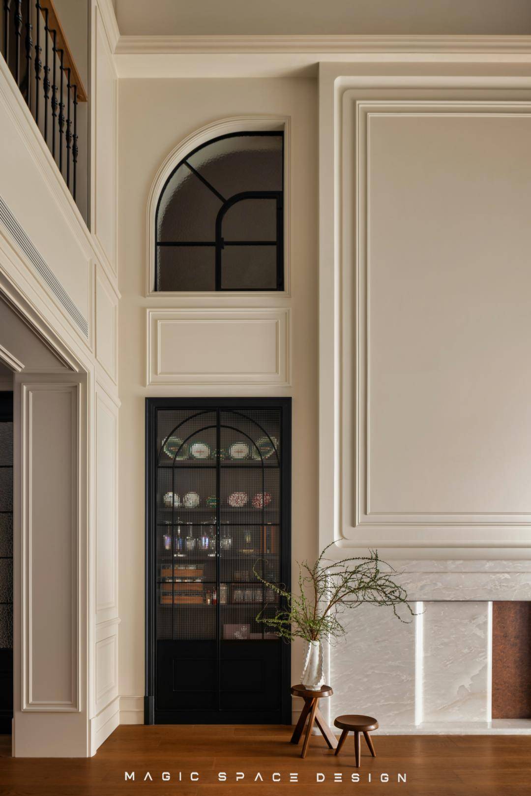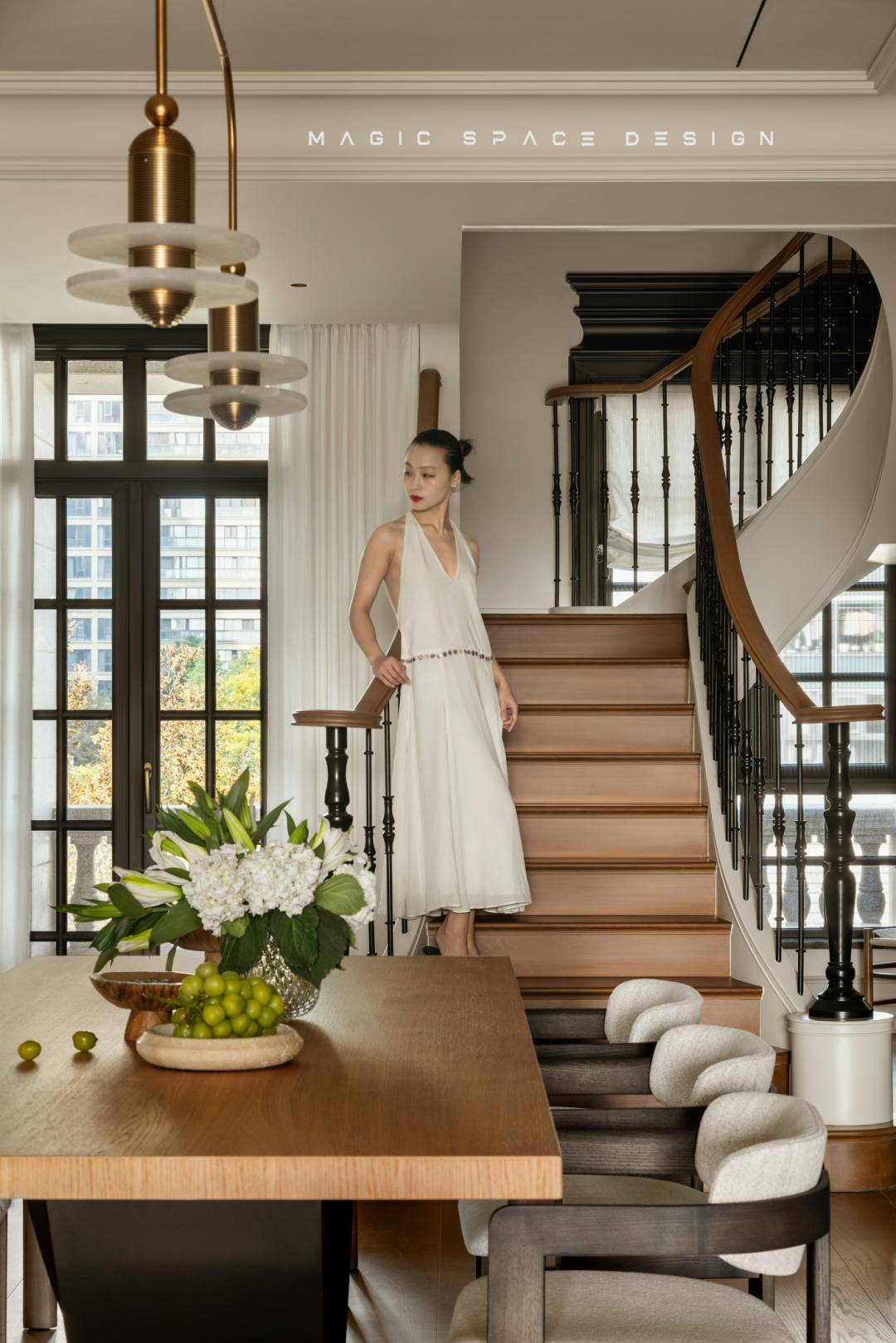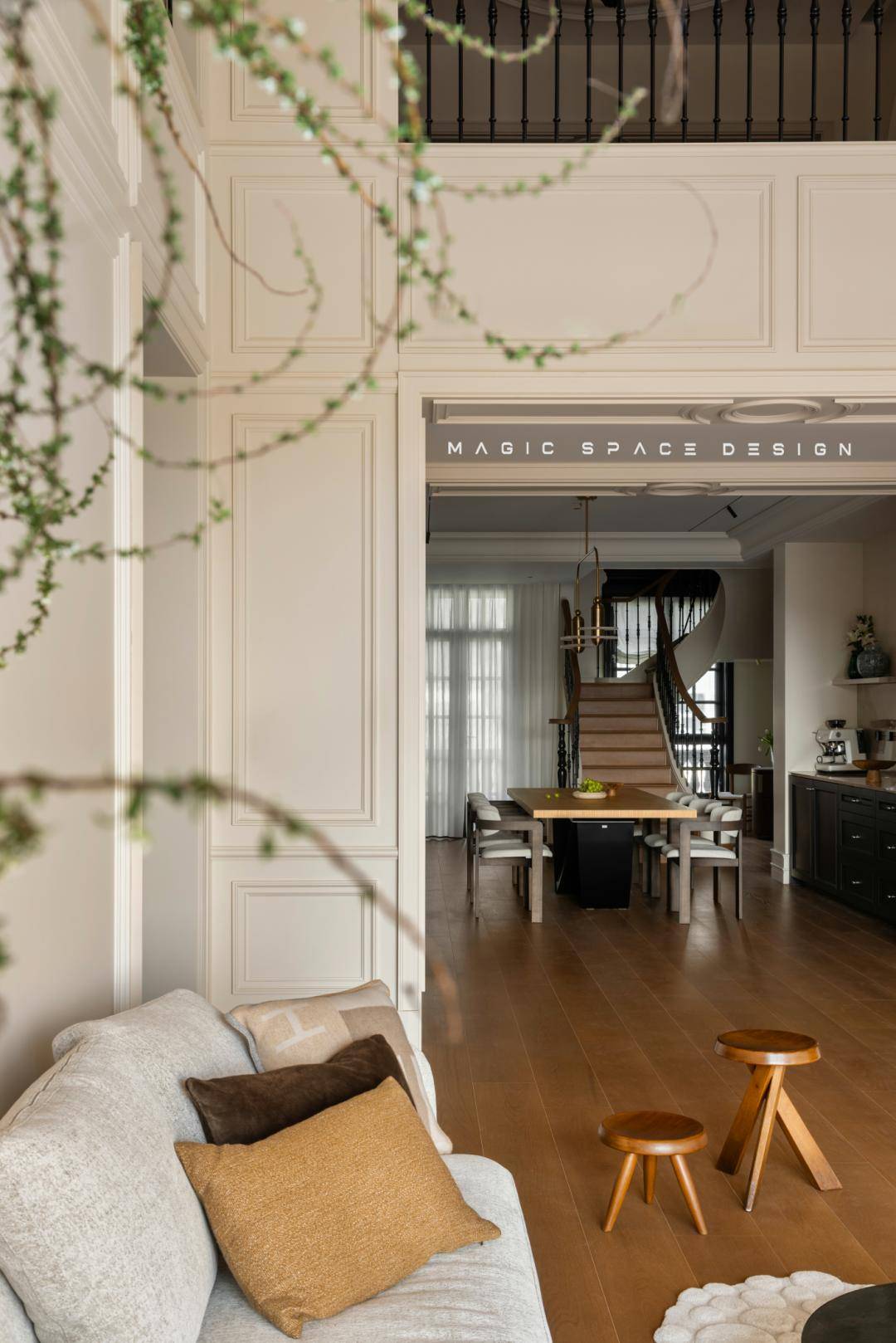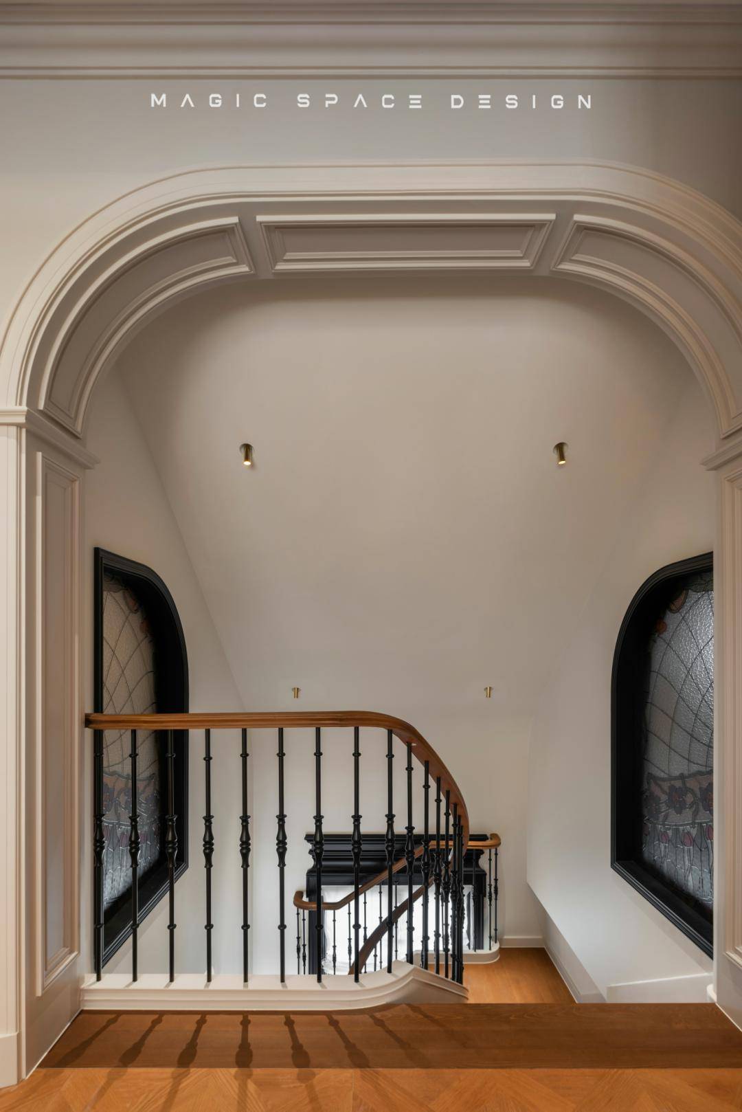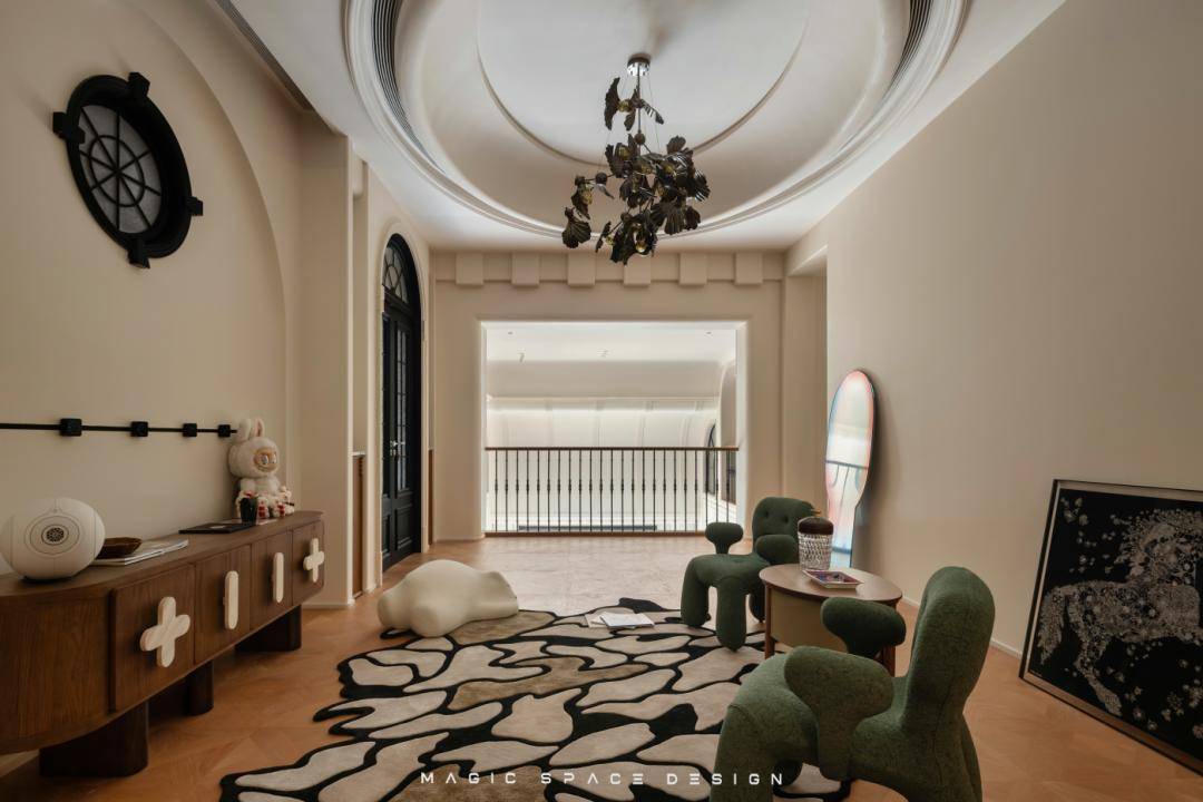 通过系统性功能重组、光环境改造、法式美学体系构建三位一体的策略,拆除原有隔墙后,楼梯被重新定义为空间的中心艺术品。木质踏步与弧形扶手曲线柔美,如同盘旋而上的立体雕塑。光线自上而下自由流动,每一步皆成风景。