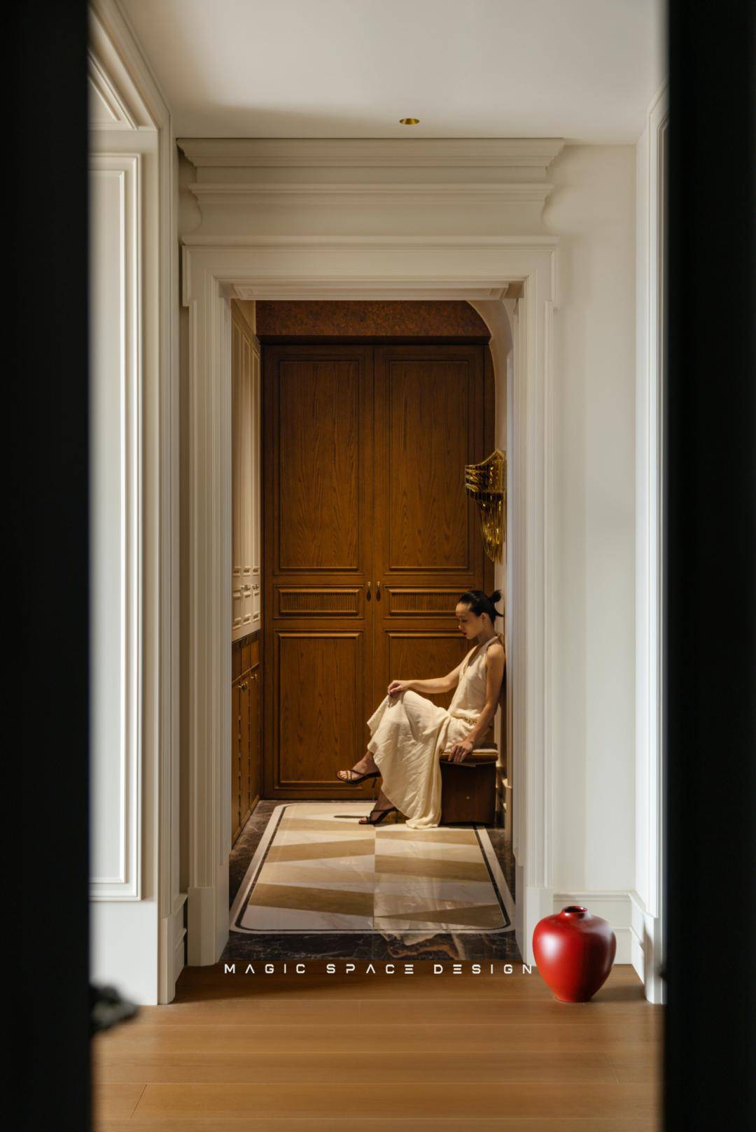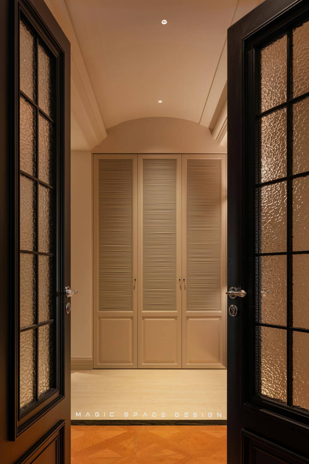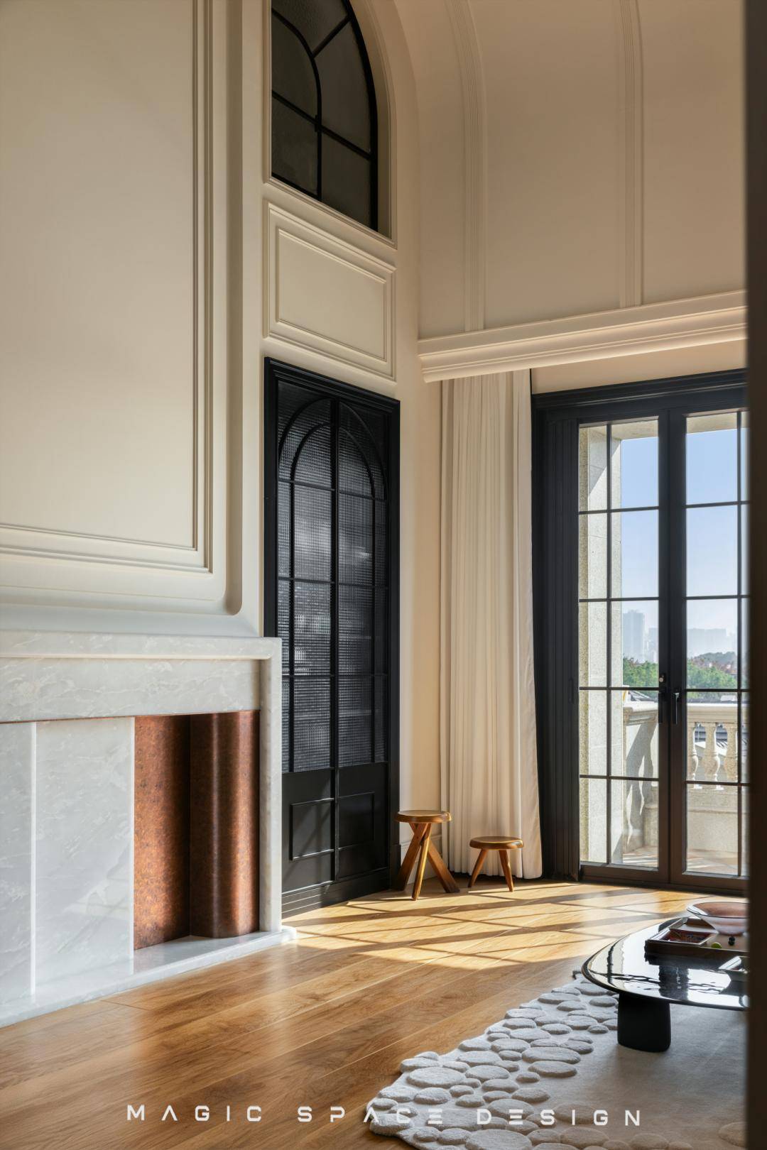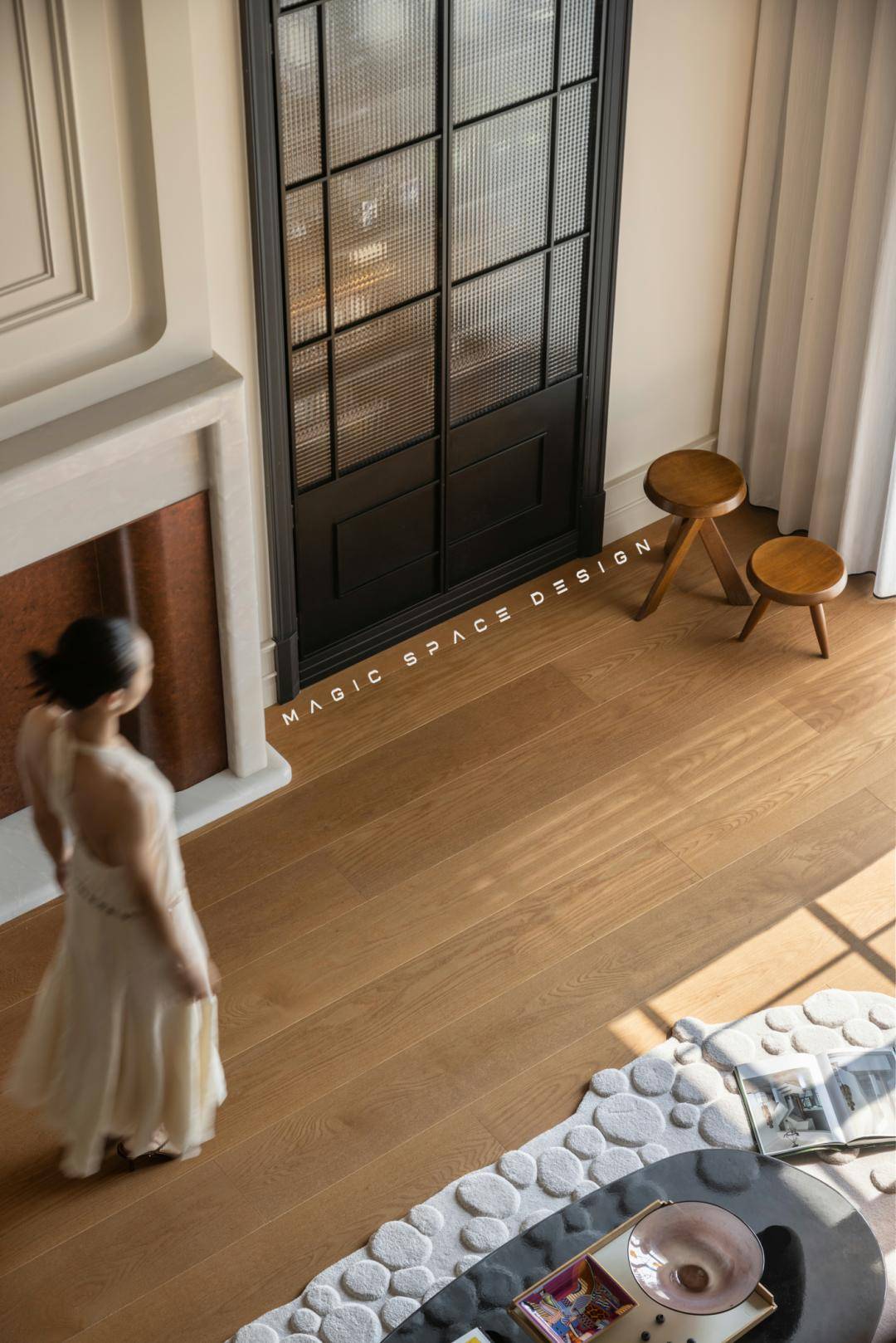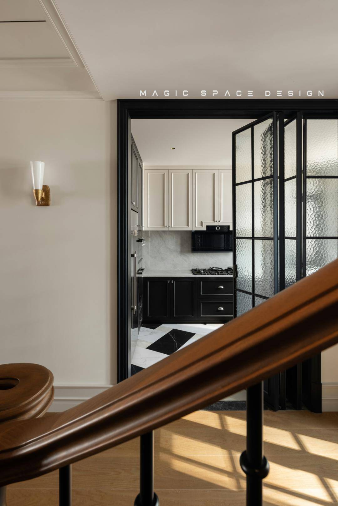 通过系统性功能重组、光环境改造、法式美学体系构建三位一体的策略,拆除原有隔墙后,楼梯被重新定义为空间的中心艺术品。木质踏步与弧形扶手曲线柔美,如同盘旋而上的立体雕塑。光线自上而下自由流动,每一步皆成风景。