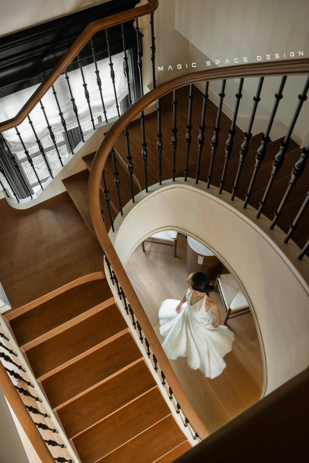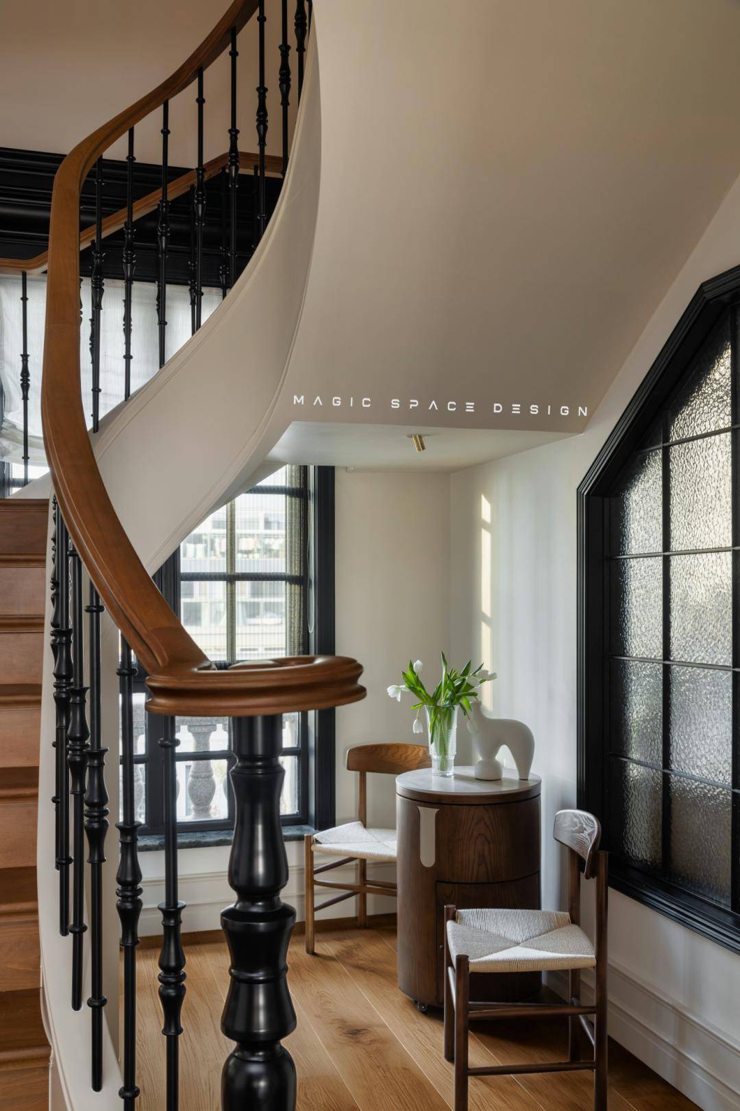 ②楼梯改变了方向,用弧形楼梯连接一层与二层,将原来设计有缺陷的位置变成家里的核心亮点;
