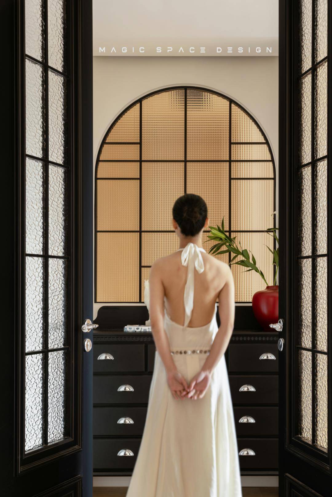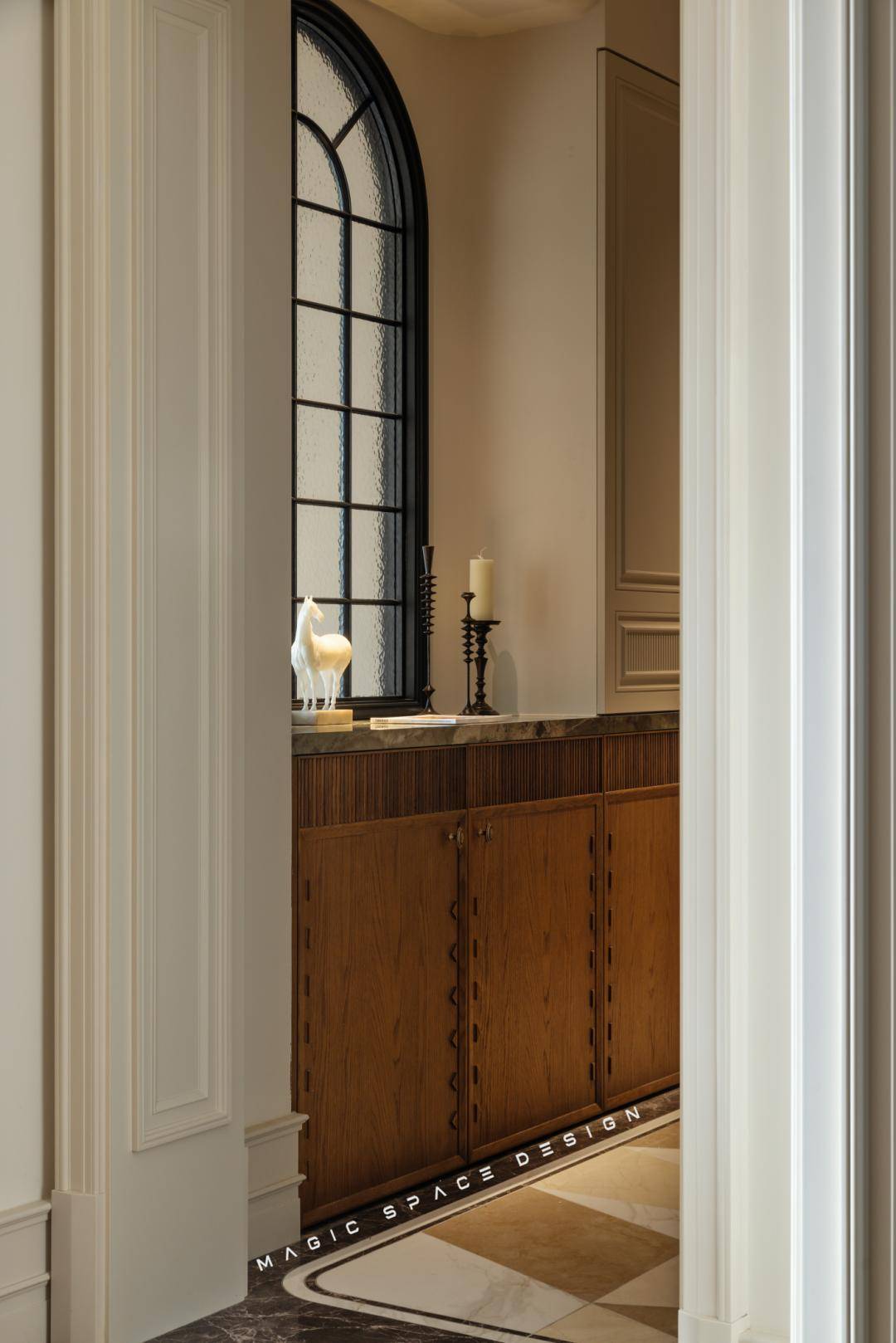 推开家门,结构与线条形成了第一道欢迎礼。雕刻艺术般的顶,地面黑金白三色拼花砖跳跃而和谐,从美学上构建美的体系,引人入胜,留下空间的第一道视觉印记。定制收纳系统隐于墙后,让日常琐碎各有归处。