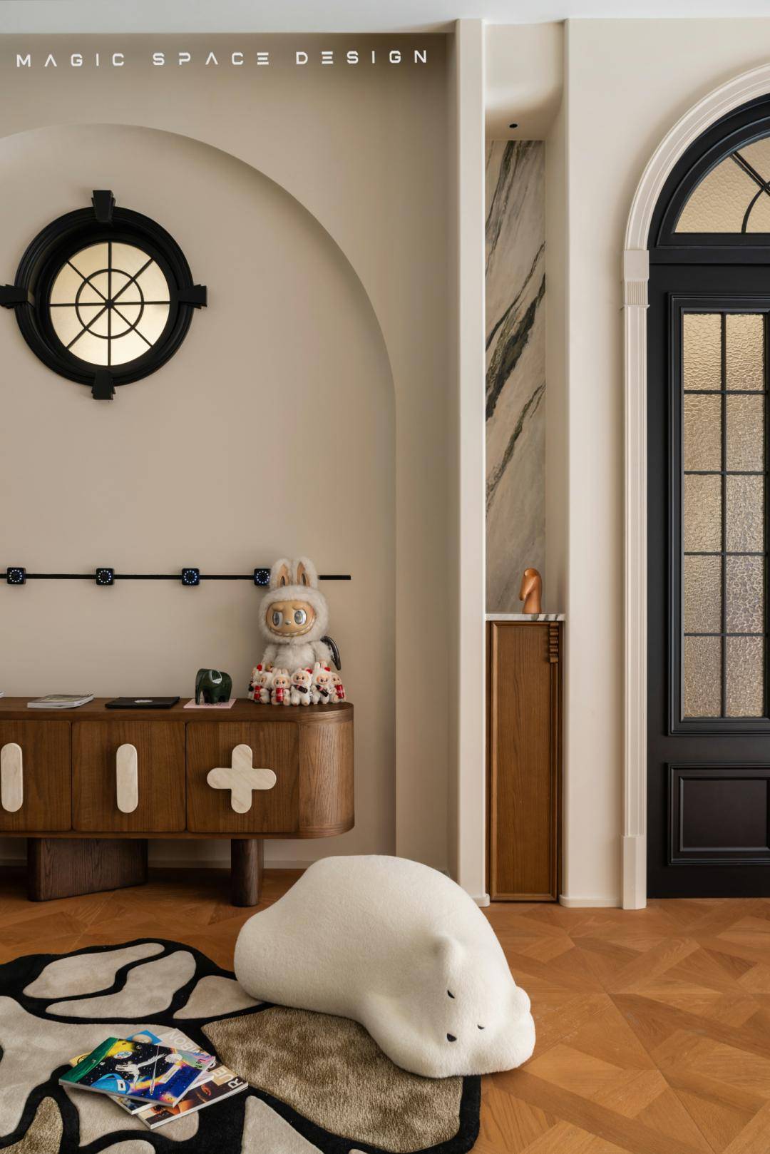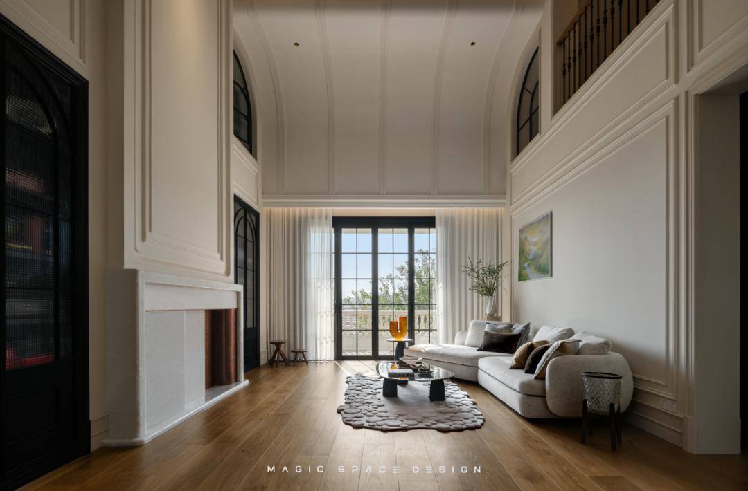 客厅以连续的弧形吊顶柔化原始顶面结构,宛如层叠波浪,引导视线流动。墙面采用对称法式线框,搭配暖白色基调与天然木纹地板,营造明亮温润的基底。弧形语言与光影共舞,空间在柔光中舒展呼吸。