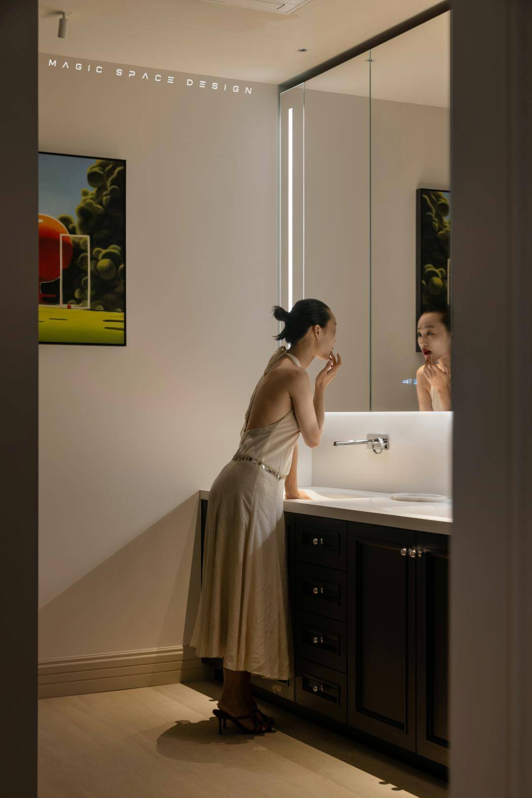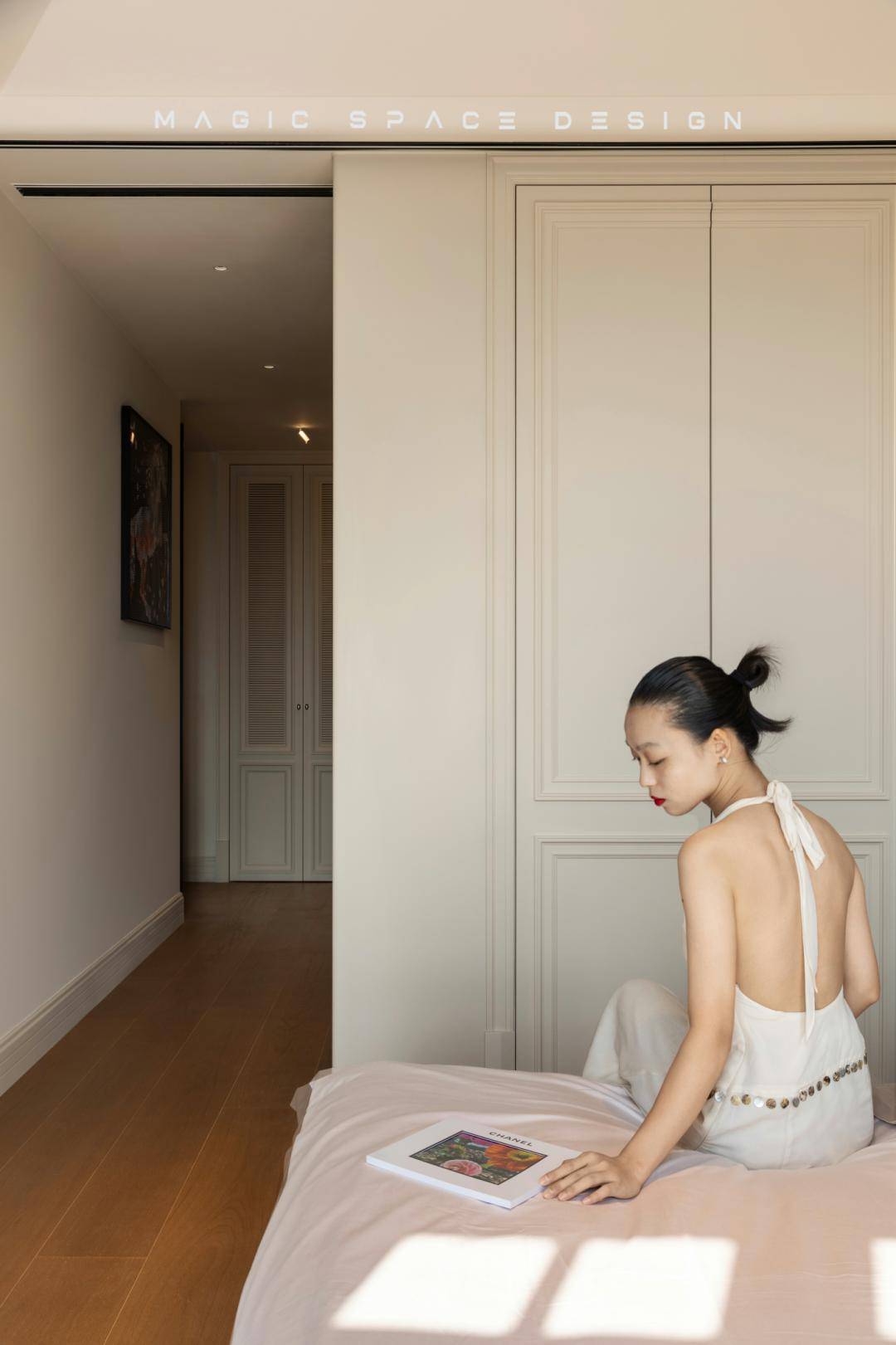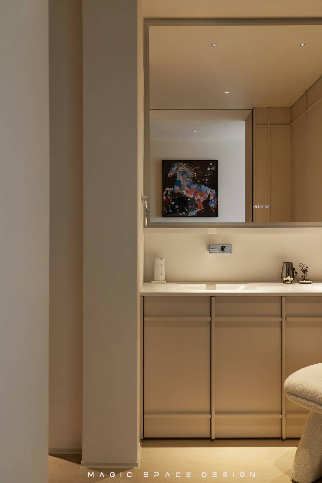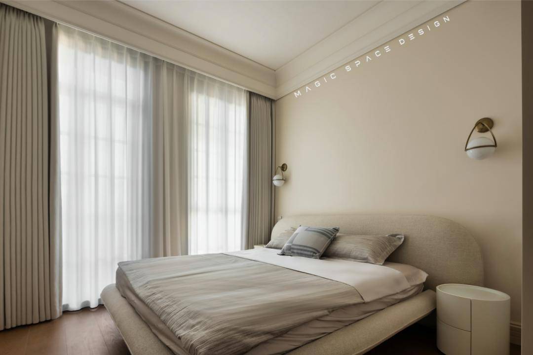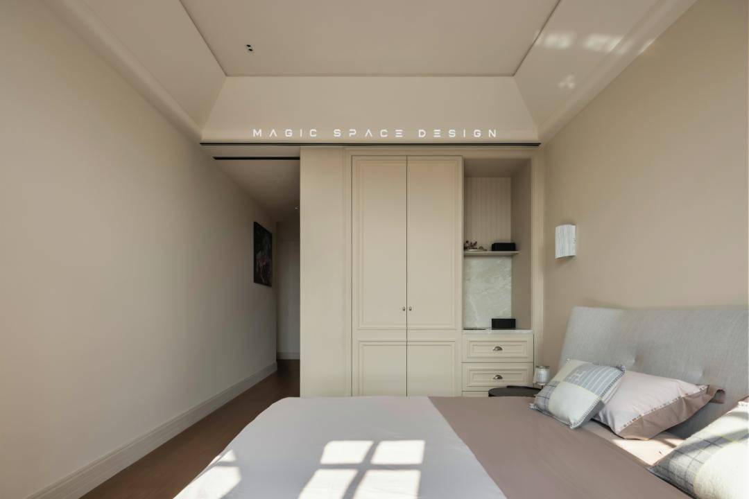 浸润木质与织物的休憩场景,以暖白与天然木色为主调,背景墙通过法式线框分割比例,营造精致秩序感。套间原本局促的功能被改善,化劣为优,依据具体的使用情景用心配置特定光环境,多重柔软材质叠加触感层次,空间静谧而包裹身心。