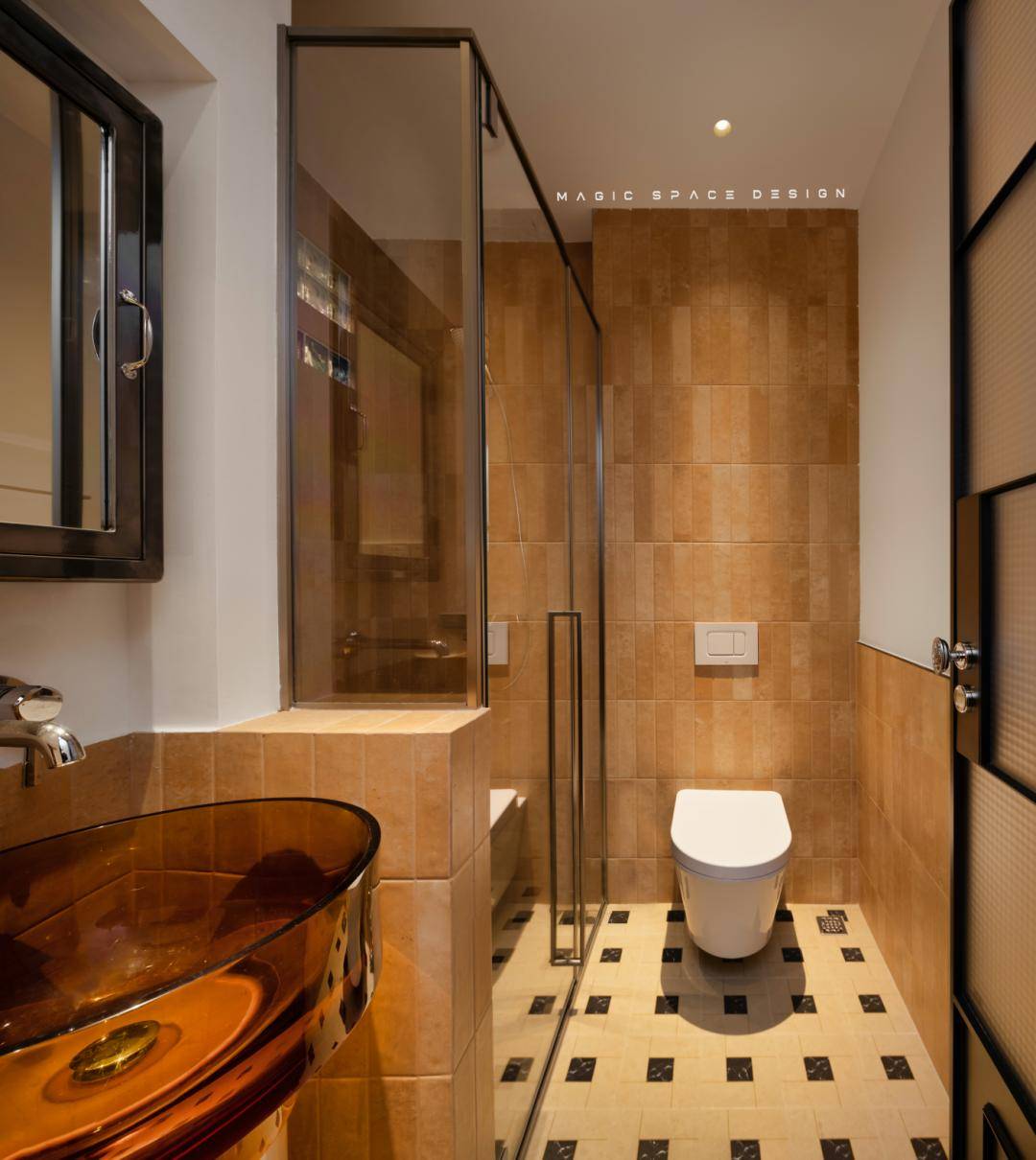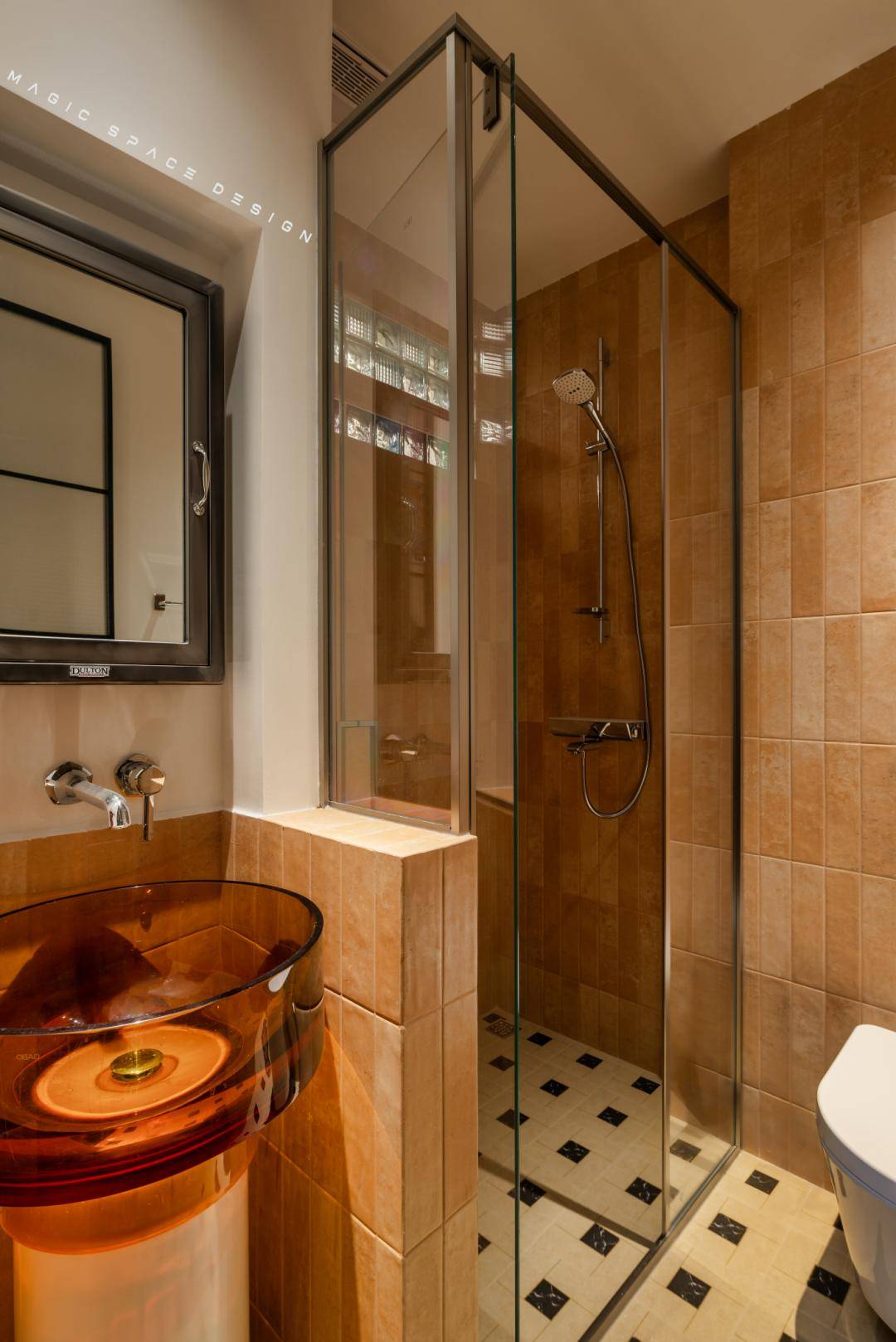 温润的渐变色墙砖,丰富了立面的视觉效果,复古且富有质感的地砖,把人直接拉入一个平行时空。半墙实在是明智之举,通透的玻璃在小空间里恰到好处地打造出想要的通透轻盈的量感,视觉之美与多重功能完美嵌合。
