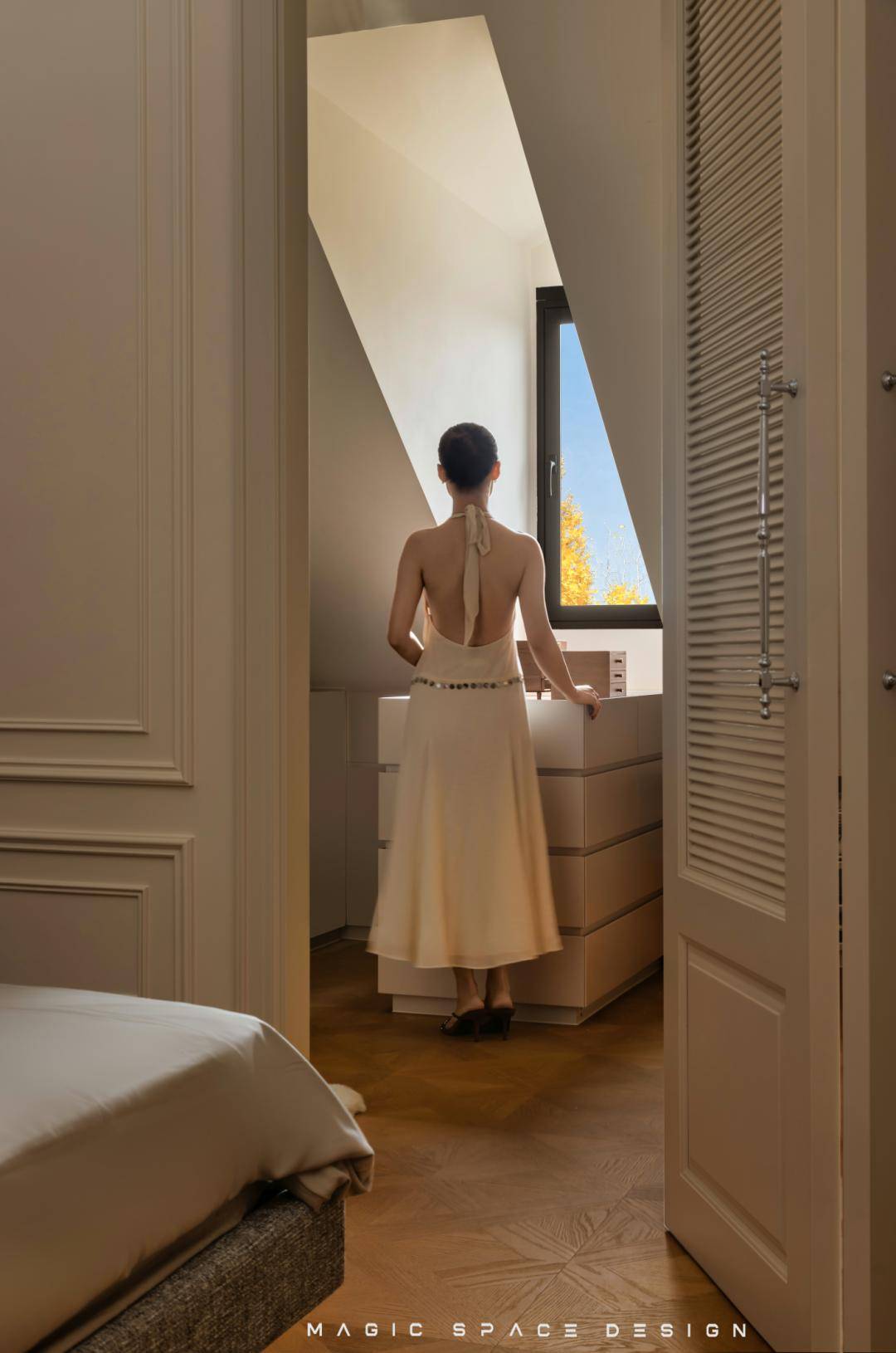 白天和夜晚的交替在窗边形成风景,房间的干净色调是低调的画框。由蓬松织物打造的温暖环境中,金属元素的点缀拉升了高级感,塑造出一个具有鲜明风格、精湛细节与高度舒适性的私谧空间。