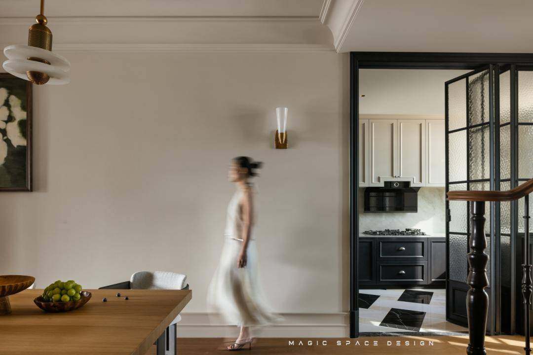 厨房形成中西分治又连贯的布局,串联起流畅自然的动线。极简的黑白色块,拼接出厨房领域,空间明亮而有序。法式风情中简约而轻快的一面在此呈现,使得整个空间既有独特氛围,又能和谐融入整体。